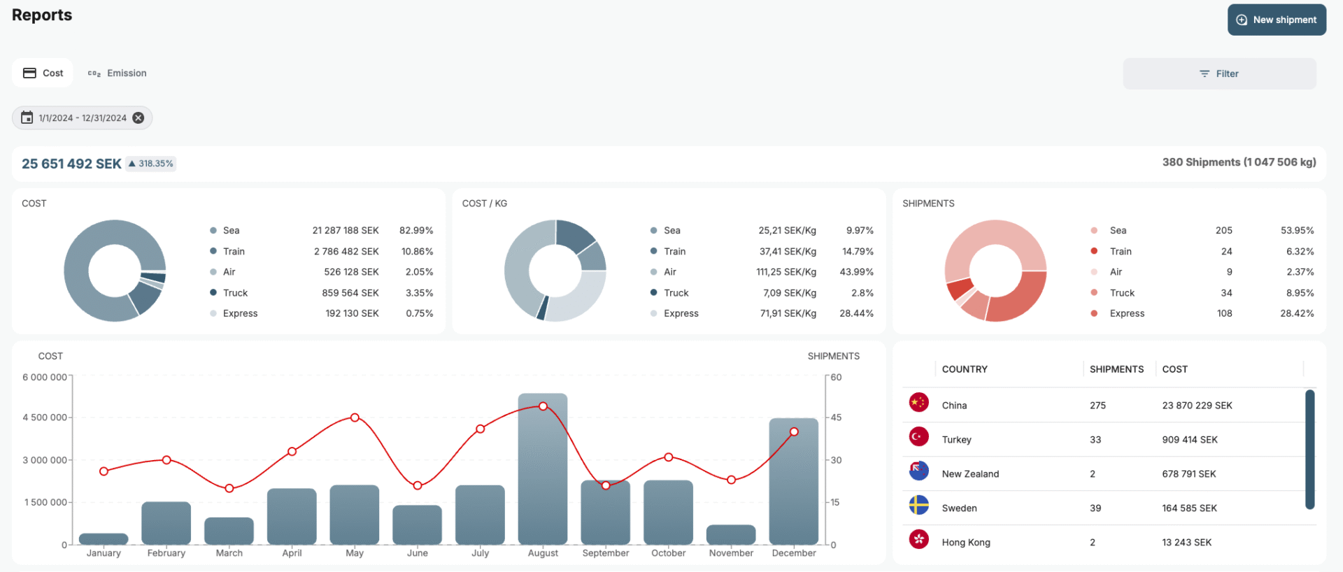 Förutom kostnader kan systemet också ta fram dina totala utsläpp från dina transporter. Utsläppen kan analyseras och jämföras mellan olika tidsperioder och i vår kundportal TKL Dispatch kan du också jämföra utsläpp mellan olika fraktsätt för att förstå hur du kan tänka för att minska utsläppen från dina transporter. För de företag som hållbarhetsrapporterar underlättar funktionen rapportering av utsläpp i scope 3 markant.